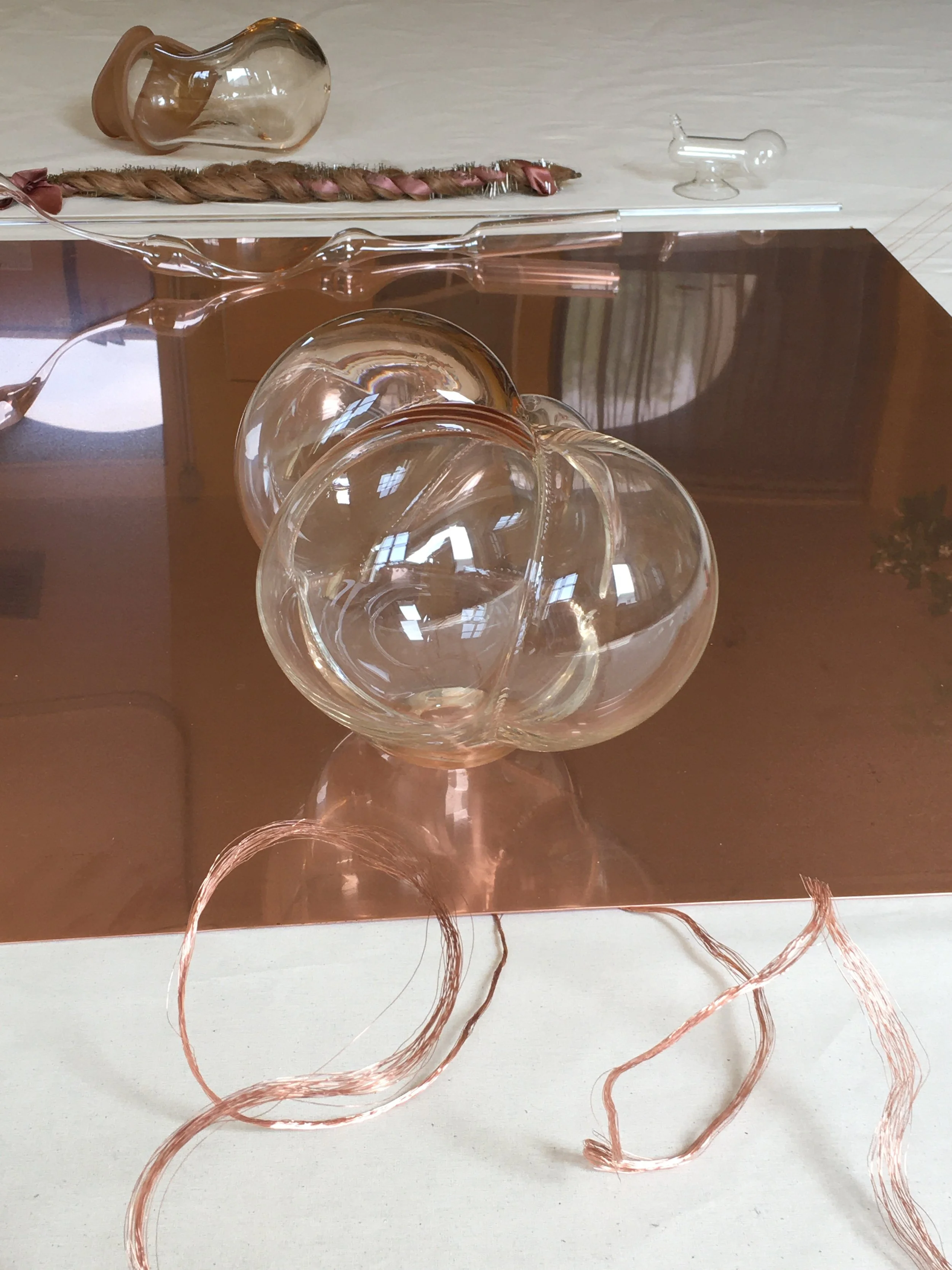 Souffle&résonance verre, cuivre,cheveux, caoutchouc/dimension variable/2022/Résidence au Grand Hospice